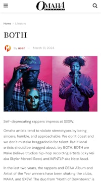 As a musician, SCKY has earned recognition both solo and as part of the duo BXTH (formerly BOTH), sharing stages with notable artists like Kid Cudi, Mac Miller, and Atmosphere, and performing at major events such as SXSW and the Baxter Arena opening for Flo Rida. His work has earned accolades including multiple OEAA Awards for Best Hip Hop and Artist of the Year, as well as audience awards for Out of Omaha, produced by J. Cole.